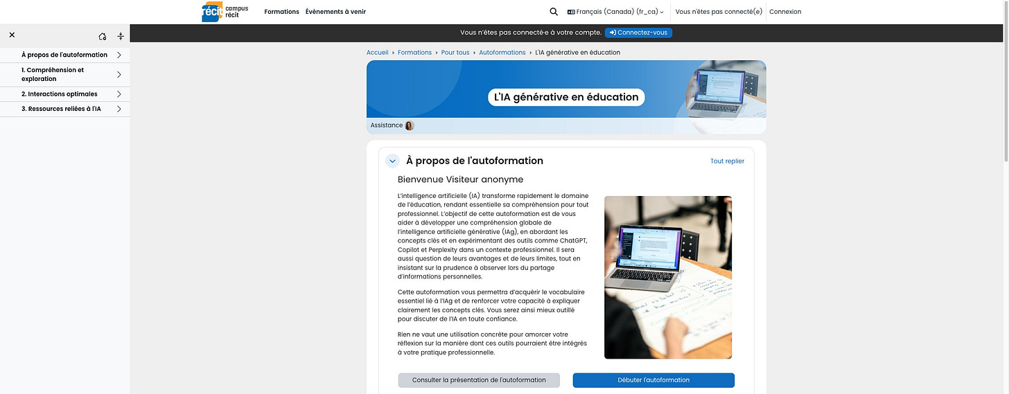 🔥 En bref : Si vous souhaitez vous former à l’IA, tout en avançant à votre rythme, cette autoformation proposée par LE RECIT (Réseau pour le développement des compétences par l’intégration des technologies) devrait vous intéresser.