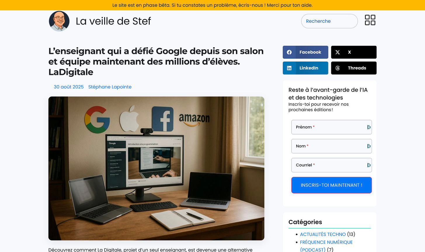 ✂️ Extrait : « Découvrez comment La Digitale, projet d’un seul enseignant, est devenue une alternative éthique à Google pour des millions d’élèves. Un guide complet sur cette innovation. Saviez-vous qu’une suite complète d’outils numériques, utilisée par des millions d’élèves dans 160 pays, a été créée par un seul enseignant sur son temps personnel ? C’est l’histoire fascinante de La Digitale, une initiative qui défie les géants de la tech. »