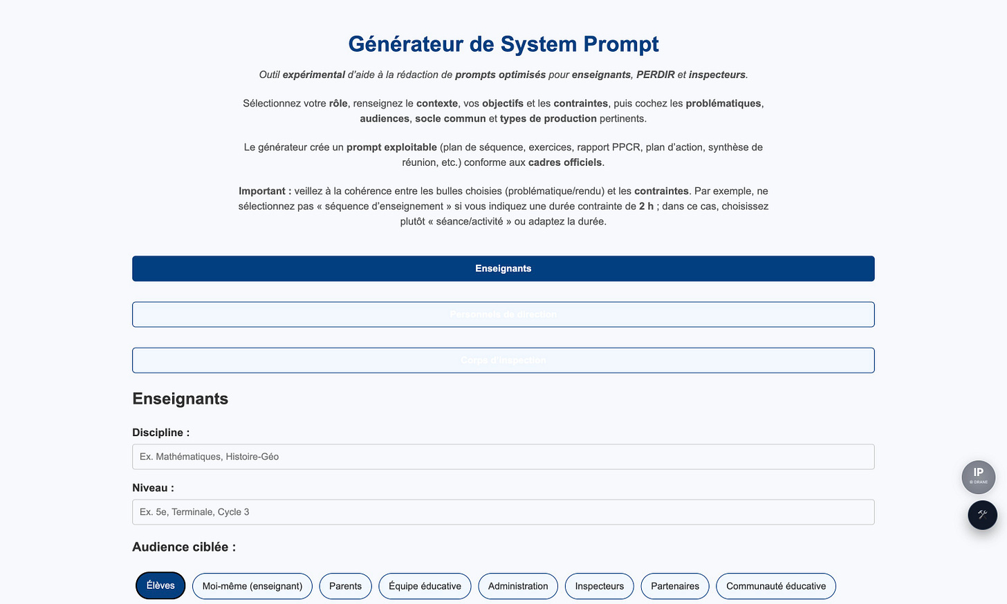 ✂️ Extrait : « Outil expérimental d’aide à la rédaction de prompts optimisés pour enseignants, PERDIR et inspecteurs.