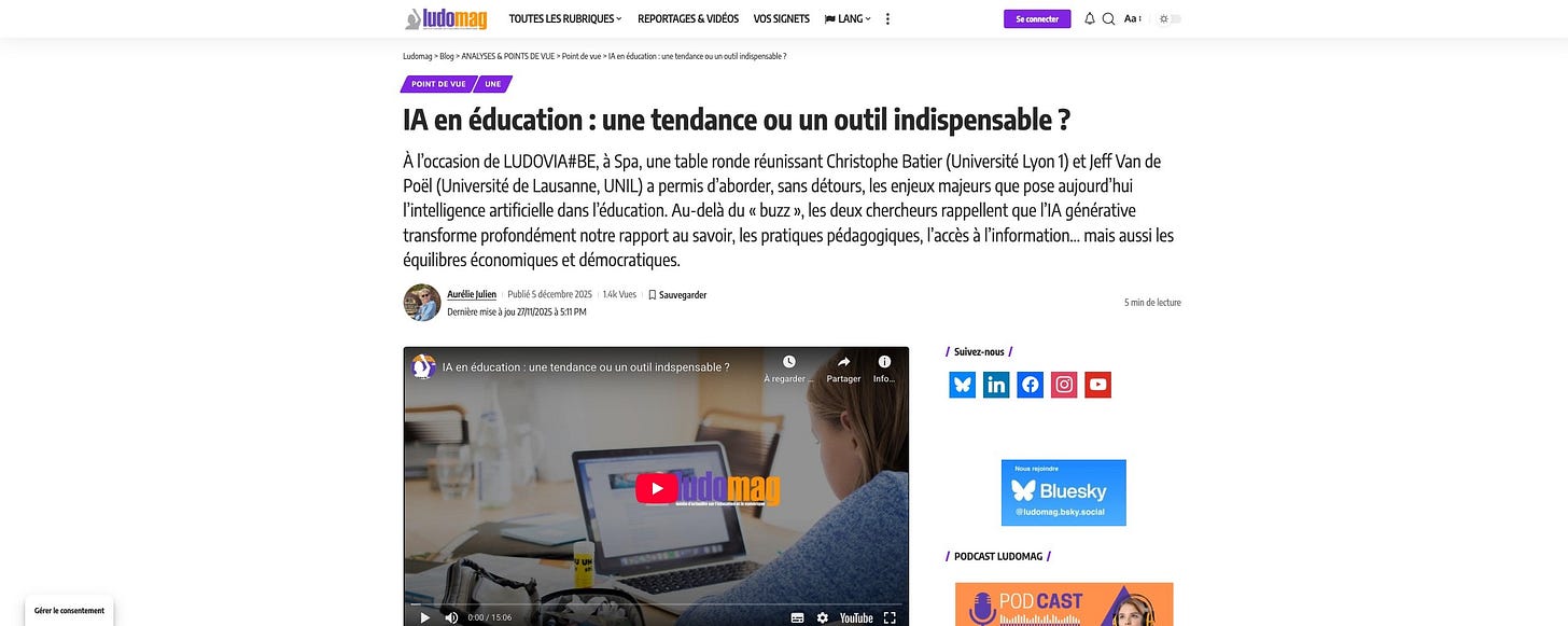 🔥 En bref : Ludomag a organisé une table ronde réunissant les chercheurs Jeff Van de Poël (Université de Lausanne) et Christophe Batier (Université de Lyon) sur les enjeux de l’IA en éducation lors de la dernière édition du salon Ludovia.